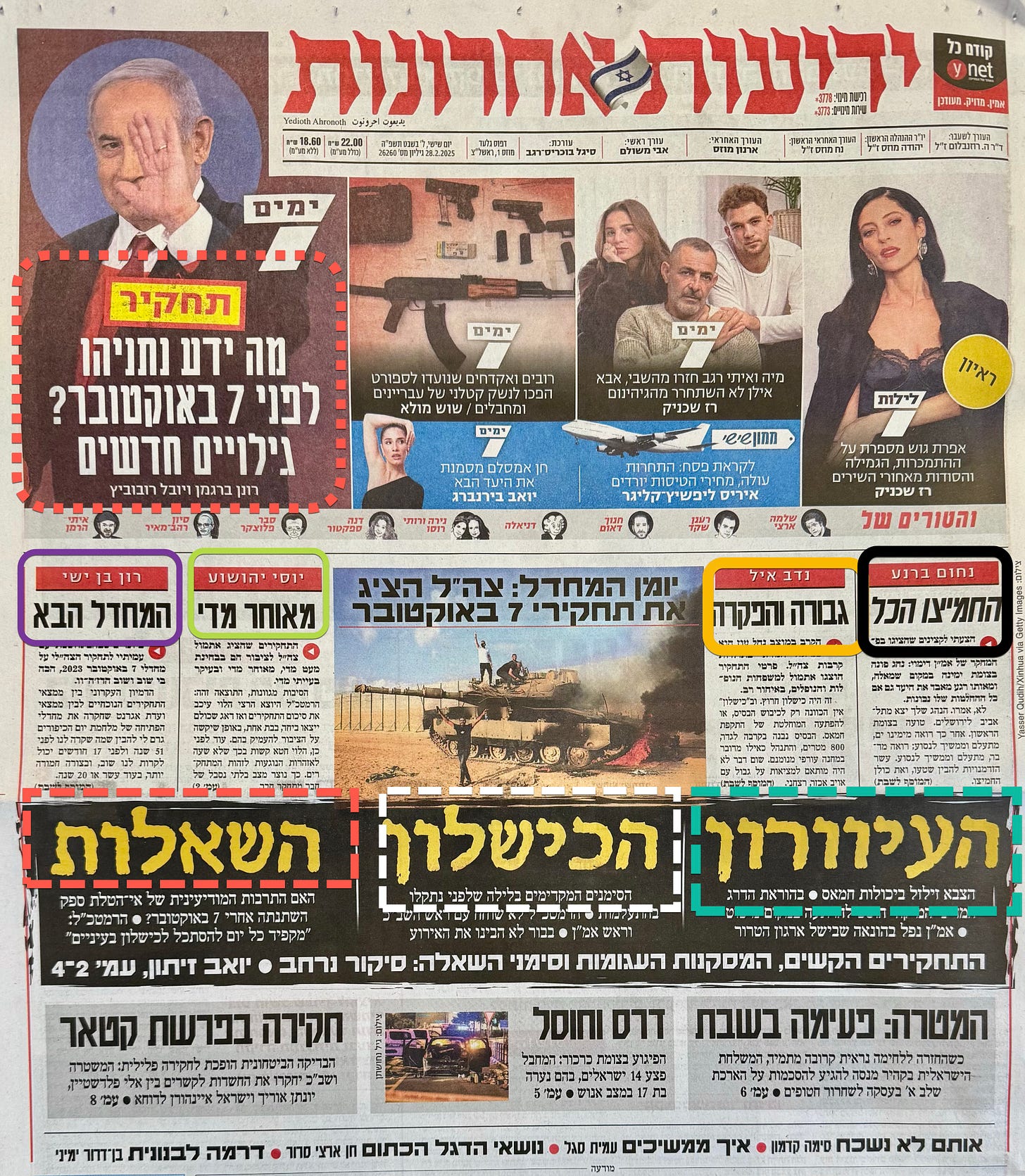 As we often do to start the week, a glimpse at the front page of Yedi’ot Ahronot, Israel’s most widely read paper. What were Israelis reading about this weekend?