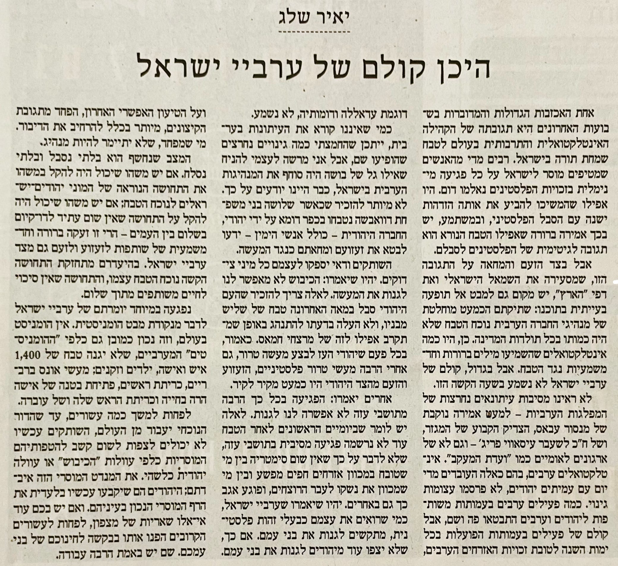 But aside from the outrage and protest over this reaction, which is stirring up the Israeli left and the pages of Haaretz, there is also room to look at a problematic phenomenon within our society: the almost complete silence of the leaders of [Israeli] Arab society in the face of a massacre unparalleled in the entire history of the country. Yes, there were some intellectuals who uttered clear and unequivocal words against the massacre. But by and large, the voice of Israeli Arabs has not been heard at this difficult time.