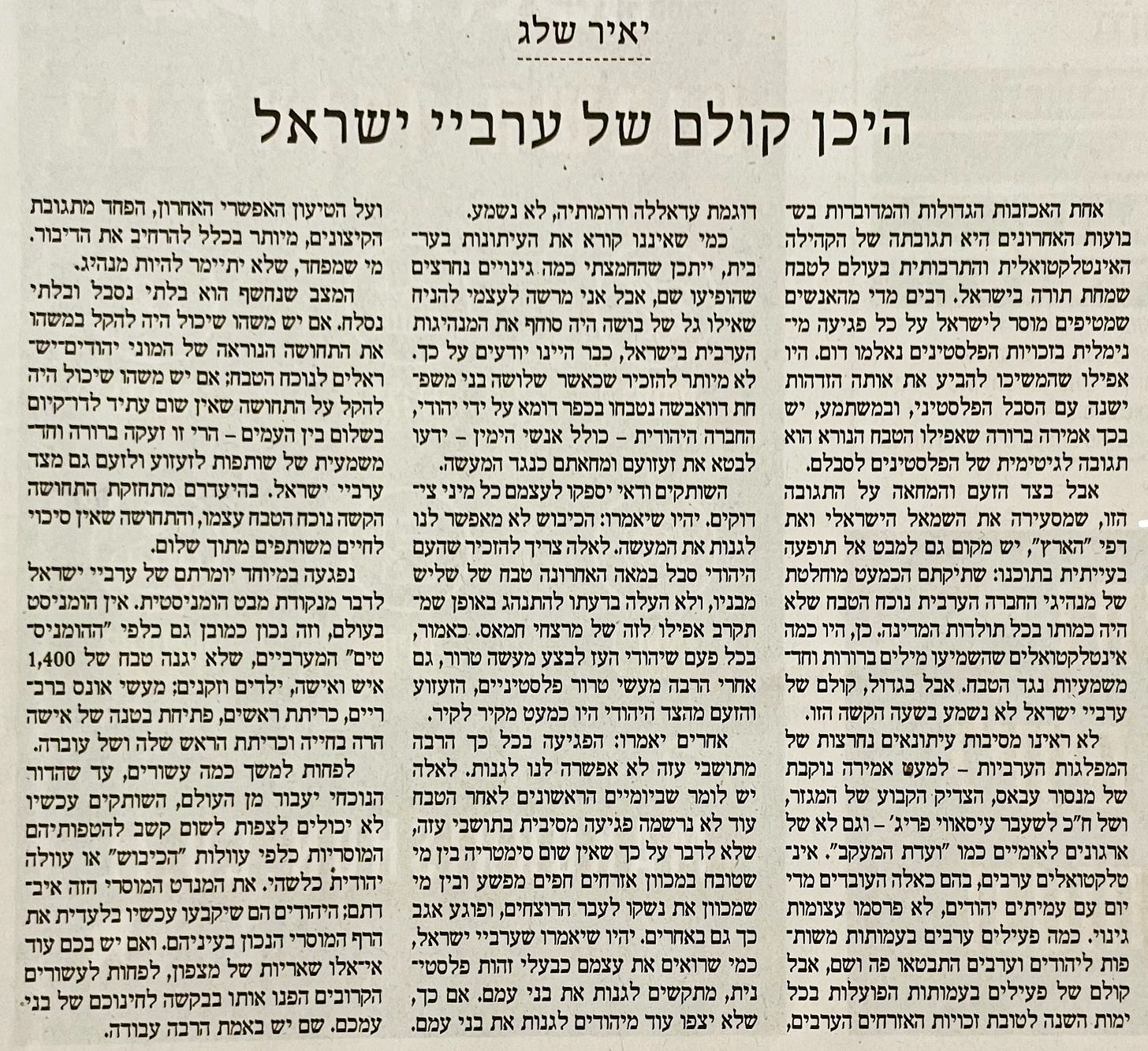 The following Op Ed by Yair Sheleg appeared on Friday in Makor Rishon. Sheleg, a leading intellectual in the religious-Zionist world, writes for Makor Rishon every Friday—his column typically appears directly under Ari Shavit, week by week.